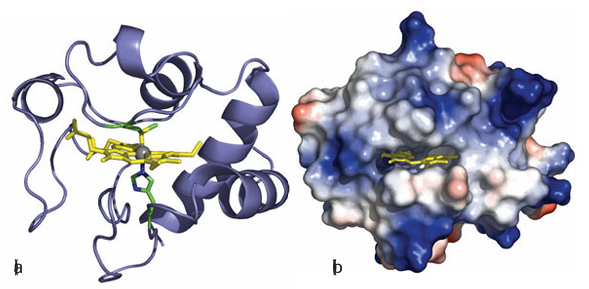 Figure 27.24 Different views (but from the same viewpoint) of mitochondrial cytochrome c. (a) The secondary structure and the position of the haem cofactor. (b) The surface charge distribution that guides the docking with its natural redox partners (red and blue areas represent patches of negative and positive charge, respectively). donor it is expected to stabilize Fe (II) rather than Fe(III). The reduction potential of cyto chrome c is 0.26 V, at the higher end of values for cytochromes in general. Cytochromes vary in the identity of the axial ligands as well as the structure of the porphyrin ligand (the notation a, b, c, d… defines positions of absorption maxima in the visible region, but also refers to variations in the substituents on the porphyrin ring). Many cytochromes, in particular those sandwiched between membrane-spanning helices, have bis(histidine) axial ligation (24). In cytochrome c, the edge of the porphyrin ring is exposed to solvent and is the most likely site for electrons to enter or leave. Specific protein–protein interactions are import ant for obtaining efficient electron transfer and the region around the exposed edge of the porphyrin ring in cytochrome c provides a pattern of charges that are recognized by cytochrome c oxidase and other redox partners. One example in particular has been well studied, that of cytochrome c with yeast cytochrome c peroxidase. The driving force for electron transfer from either of the two catalytic intermediates of peroxidase (Section 27.10) to each reduced cytochrome c is approximately 0.5 V. Figure 27.25 shows the structure of a bimolecular complex formed between cytochrome and cytochrome c peroxidase. Electrostatic interactions guide the two proteins together within a distance that is favourable for fast electron tunnelling between cytochrome c and two redox centres on the peroxidase, the haem cofactor and tryptophan-191 (Section 27.10).