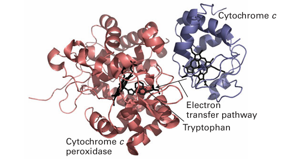 Figure 27.25 The bimolecular ET complex between cytochrome c and cytochrome c peroxidase produced by co-crystallization of cytochrome c with the Zn derivative of cytochrome c peroxidase. The orientation suggests an electron transfer pathway between the haem groups of cytochrome c and cytochrome c peroxidase that includes tryptophan.