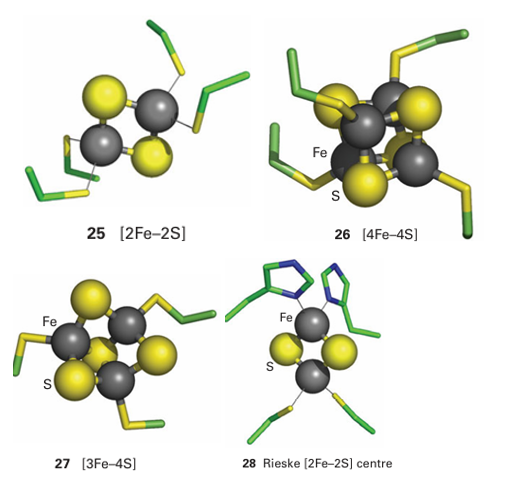 Key points: Iron–sulfur clusters generally operate at more negative potentials than cytochromes; they are composed of high-spin Fe (III) or Fe (II) with sulfur ligands in a mainly tetrahedral environment. Iron–sulfur clusters are widespread in biology, although their importance was not established as early as cytochromes on account of their lack of distinctive optical characteristics. By convention, FeS clusters are represented by square brackets showing how many Fe and non-protein S atoms are present, as in [2Fe–2S] (25), [4Fe–4S] (26), and [3Fe–4S] (27). The efficacy of FeS clusters as fast ET centres is largely due to their being able to delocalize the added electron to varying degrees, which minimizes bond length changes and decreases the reorganization energy. The presence of sulfur ligands to provide good lead-in groups is also important. Small ET proteins containing FeS clusters are known as ferredoxins, where as in many large enzymes, FeS clusters are arranged in a relay, less than 1.5 nm apart, to link remote redox sites in the same molecule. The relay concept is illustrated in Fig. 27.26 with a class of enzymes known as hydrogenases, which we discuss further in Section 27.14. In nearly all cases, the Fe atoms are tetrahedrally coordinated by cysteine thiolate (RS-) groups as the protein ligands. The overall assembly, including the protein ligands, is known as an ‘FeS centre’. Examples are known in which one or more of the Fe atoms is coordinated by non-thiolate amino acid ligands, such as carboxylate, imidazole, and alkoxyl (serine), or by an exogenous ligand such as H2 O or OH, and the coordination number about the Fe subsite may be increased to six. The cubane [4Fe 4S] (26) and cuboidal [3Fe 4S] (27) clusters are obviously closely related, and may even interconvert within a protein by the addition or removal of Fe from one subsite. Larger clusters also occur, such as the ‘super clusters’ [8Fe 7S] and [Mo–7Fe–8S–X] found in nitrogenase (Section 27.13). Despite the presence of more than one Fe atom, FeS clusters generally carry out single electron transfers and are good examples of mixed-valence systems comprising Fe (III) and Fe (II). The redox state of a cluster is commonly represented by summing the charges due to Fe (3+or 2+, respectively) and S atoms (2-) and the resultant overall charge, which is referred to as the oxidation level, is written as a superscript.