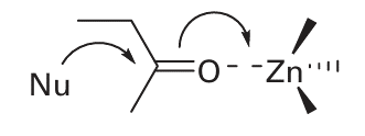 In the Zn-carbonyl mechanism, the Zn ion acts directly as a Lewis acid to accept an electron pair from the carbonyl O atom, and its role is therefore analogous to H in acid catalysis: