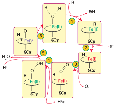 The catalytic cycle has been studied using a combination of kinetic and spectroscopic methods (Fig. 27.37). Starting from the resting enzyme, which is Fe (III), the binding of the substrate in the active site pocket (1) induces release of the coordinated H2 O molecule. This step is detected as a change in spin state from low spin (S=1/2) to high spin (S=5/2) and the re duction potential increases, causing an electron to be transferred (2) from a small [2Fe 2S] containing protein known as putidaredoxin. The five-coordinate Fe (II) that is formed resem bles deoxymyoglobin and binds O2(3). Unlike in myoglobin, addition of a second electron is both thermodynamically and kinetically favourable. The subsequent reactions (4 6) are very fast, but it is thought that an Fe (III) peroxide intermediate is formed that undergoes rapid heterolytic O-O cleavage to produce a species similar to Compound I of peroxidases. In what is known as the oxygen rebound mechanism, the Fe(IV)=O group abstracts an H atom from the substrate and then inserts it back as an OH radical. This process is remark able, as it amounts to the ‘taming’ of an O atom or OH radical by its attachment to Fe.