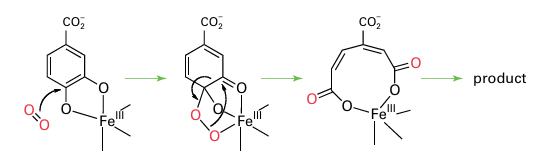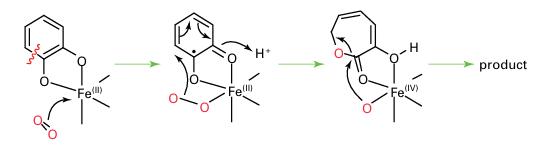 By contrast, in the Fe (II) enzymes, which are known historically as extradiol oxygenases, the Fe binds O2 directly and activates it to attack the organic substrate: