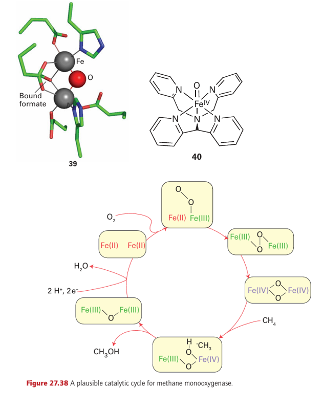 The principle of oxo-glutarate-dependent oxygenases is that the transfer of one O atom of O2 to 2-oxoglutarate (also known as α-ketoglutarate) results in its irreversible decarboxy lation, thus driving insertion of the other O atom into the primary substrate. Examples include enzymes that serve in cell signalling by modifying an amino acid in certain tran scription factors (Section 27.15). Oxygenases play a crucial role in the metabolism of methane, a greenhouse gas. Of all hydrocarbons, methane contains the strongest C–H bonds and is the most difficult to activate. Methane-metabolizing bacteria produce two types of enzyme that catalyse the conversion of methane to methanol (a more useful chemical and fuel) and thus attract much industrial interest. One is a membrane-bound enzyme that contains Cu atoms. This enzyme, known as ‘particulate’ methane monooxygenase (p-mmo), is expressed when high levels of Cu are available. The other enzyme, soluble methane monooxygenase (s-mmo), contains a dinuclear Fe active site (39) that is related to haemerythrin (21) and acid phosphatase (33). The mechanisms are not established but Fig. 27.38 shows a plausible catalytic cycle for s-mmo. The intermediate Fe (IV) species that is proposed differs from those we have encountered up to now, as the O2-derived oxido ligands are bridging rather than terminal. Despite the importance of Fe (IV) as an enzyme intermediate, small Fe (IV) complexes that could provide important models for understanding the enzymes have been elusive. The easiest to prepare are haem analogues in which Fe is equatorially ligated by porphyrin and which can be formed by reacting the Fe (II) or Fe (III) forms with a peroxo acid. Small models of non-haem Fe (IV) species have now been prepared. The mononuclear complex (40) containing the pentadentate pentaaza ligand N, N-bis(2-pyridylmethyl)-N bis(2-pyridyl) methylamine is formed by treating the Fe (II) complex with the oxo-transfer agent iodosylbenzene. It is fairly stable at room temperature and has been structurally characterized by X-ray diffraction. A powerful oxidizing agent, it can also be generated in acetonitrile solution by bulk electrolysis of the Fe (II) complex in the presence of water, and the standard potential for Fe (IV)/Fe (III) is estimated to be 0.9 V relative to the ferro cinium/ferrocene couple. Complex (40) and similar species are paramagnetic (S=1) and show characteristic absorption bands in the near-infrared. The Fe–O bond length in (40) is 164 pm, which is fully consistent with a multiple bond in which the O atom is acting as a π donor. Complex (40) is able to oxygenate C–H bonds in a variety of hydrocarbons,