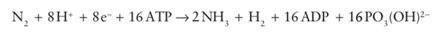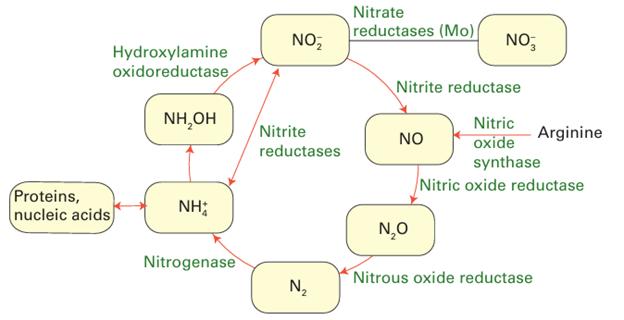 Many of the compounds are toxic or environmentally challenging. Ammonia is a crucial compound for the biosynthesis of amino acids and NO3 is used as an oxidant. Molecules such as NO are produced in small amounts to serve as cell signalling agents that play a crucial in physiology and health. Nitrous oxide, which is isoelectronic with CO2, is a potential greenhouse gas: its release to the atmosphere depends on the balance between activities and abundancies of NO reductase and N2O reductase across the bio logical world. The so-called ‘nitrogen-fixing’ bacteria found in soil and root nodules of certain plants contain an enzyme called nitrogenase that catalyses the reduction of N2 to ammonia in a reaction that is coupled to the hydrolysis of 16 molecules of ATP and the production of H2: