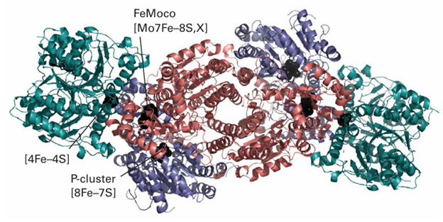 Figure 27.47 The structure of nitrogenase showing the Fe protein and the MoFe protein complexed with each other. Positions of the metal centres (black) are indicated. The MoFe protein is an α2β2 of different subunits (red and blue) and it contains two P-clusters and two MoFe cofactors. The Fe protein (green) has a [4Fe 4S] cluster and it is also the site of binding and hydrolysis of Mg-ATP.