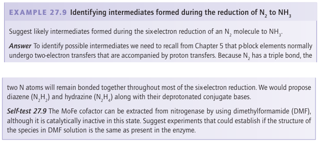 Fixed’ nitrogen is essential for the synthesis of amino acids and nucleic acids, so it is central to agricultural production. Industrial production of ammonia by the Haber process (Section 26.12) involves reaction of N2 and H2 at high pressures and high temperatures; by contrast, nitrogenase produces NH3 under normal conditions, and it is small wonder that it has attracted so much attention. Indeed, the mechanism of activation of the N2 molecule by nitrogenase has inspired coordination chemists for several decades. The process is very costly in terms of energy for a reaction that is not very unfavourable thermodynamically. However, as we saw in Section 15.6, N2 is an unreactive molecule and energy is required to overcome the high activation barrier for its reduction. Nitrogenase is a complex enzyme that consists of two types of protein: the larger of the two is called the ‘MoFe-protein’ and the smaller is the ‘Fe-protein’ (Fig. 27.47). The Fe-protein contains a single [4Fe–4S] cluster that is coordinated by two cysteine residues from each of its two subunits. The role of the Fe-protein is to transfer electrons to the MoFe-protein in a reaction that is far from understood: in particular, it is unclear why each electron transfer is accompanied by the hydrolysis of two ATP molecules, which are bound to the Fe-protein.