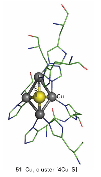 which is proposed to be C, N, or O. It was nearly ten years after the determination of the structure of the MoFeS cage that this small central atom was discovered, after improve ments in resolution and detailed consideration of the X-ray interference characteristics. The six Fe atoms would otherwise be three-coordinate with a flattened trigonal-pyramidal geometry. Nitrate reductase is another example of a Mo enzyme involved in the transfer of an O atom, in this case catalysing a reduction reaction (the standard potential for the NO3/NO2 couple corrected to pH=7 is+0.4 V, thus NO3 is quite strongly oxidizing). The other enzymes in the nitrogen cycle contain either haem or Cu as their active sites. There are two distinct classes of nitrite reductase. One is a multi-haem enzyme that can reduce nitrite all the way to NH3. The other class contains Cu and carries out one-electron transfer, producing NO: it is a trimer of identical subunits, each of which contains one ‘blue’ Cu (mediating long-range electron transfer to the electron donor, usually a small ‘blue’ Cu protein) and a Cu centre with more conventional tetragonal geometry that is thought to be the site of nitrite binding.