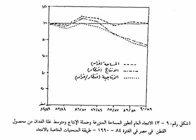 ولتوضيح طريقة تنفيذ ورسم هذا النوع من الرسوم البيانية نقوم بتحويل القيم الأصلية للظاهرات المختلفة في التمييز بين كمياتها (فدان ، أردب ، ألف طن) إلى نسب مئوية بعد نسبتها إلى أساس رقمى محدد من قيمة معلومة (قيمة الأساس). وستوضح النتيجة اتجاه الزيادة أو التناقص عن قيمة الأساس. فمثلاً لو كانت لدينا البيانات التالية عن محصول القطن المساحة، ومتوسط غلة الفدان، وكمية الإنتاج خلال فترات زمنية متعاقبة وأردنا معرفة اتجاه التطور فيها، فإننا نعتبر بيانات الفترة الأولى هي قيمة الأساس والمقارنة ونعتبر نسبتها في هذه الحالة 100% ثم بعد ذلك نقوم بقسمة جميع قيم الظاهرة الواحدة على قيمة نسبة الأساس ويضرب الناتج فى 100 لنحصل عليها النسبة المئوية للظاهرة للوحدة في الفترة الزمنية المحددة. وتوقع هذه النسب على الرسم البياني لتحصل منها منحني بياني يوضح الاتجاه العام لهذه الظاهرة. ويتبع هنا نفس الأسلوب الكارتوجرافي مع الخطوط البيانية البسيطة كما يتضح من الشكل رقم (9 - 3) ومن دراسة الشكل يمكن استخلاص الكثير من الحقائق التي قد لا توضحها البيانات الأصلية، كما يمكن أن نستنتج من الرسم البياني مباشرة نوع الارتباط بين أية ظاهرة وظاهرة أخرى أو بين ظاهرة وعدة ظاهرات أخرى وذلك بمقارنة الاتجاه العام للمنحنيات الخاصة بكل منها.