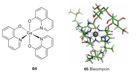 Compounds of Ga (III) are under investigation as anti-cancer drugs. Like Fe (III), Ga (III) is a hard Lewis acid and the two metal ions have similar radii, however Ga (III) is not easily reduced to Ga(II) and any redox or O2 binding proteins that have incorporated Ga in place of Fe will be inactive. It is thought that Ga (III) enters cells using the same transport systems as Fe. The target for Ga is the Fe-containing enzyme ribonucleotide reductase, which is essential for producing the bases used in DNA. Compounds undergoing trials range from simple salts like gallium nitrate to complexes such as (64) that can pass through the intestinal wall. The challenge with cancer chemotherapy is to identify complexes that select malignant cells and ignore healthy cells. Some Ru complexes undergo selective interaction with DNA, and are activated on irradiation, becoming potent oxidizing agents capable of carrying out cleavage of phosphodiester linkages. This method of treating cancers is known as phototherapy. Bleomycin (65) is representative of a class of drug that appears to function by binding to DNA and generating, on reaction with O2, an Fe (IV) (ferryl) species that oxygenates particular sites and leads to degradation.