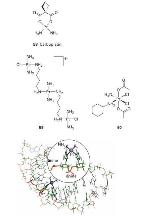Key points: The complex cis-[PtCl2(NH3)2] results in the inhibition of DNA replication and prevention of cell division; other drugs cause DNA to be degraded by oxygenation. ‘Cancer’ is a term that covers a large number of different types of the disease, all characterized by the uncontrolled replication of transformed cells that overwhelm the normal operation of the body. The principle of treatment is to apply drugs that destroy these malignant cells selectively. The remarkable action of the complex cis- [PtCl2 (NH3 )2] (57, known as cisplatin) was discovered in 1964 while examining the effect of an electric field on the growth of bacteria. The behaviour of a colony of bacteria suspended in solution between two platinum electrodes was observed, and it was noted that the cells continued to grow in size, forming long filaments, but stopped replicating. The effect was traced to a complex that was