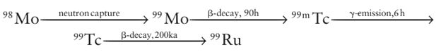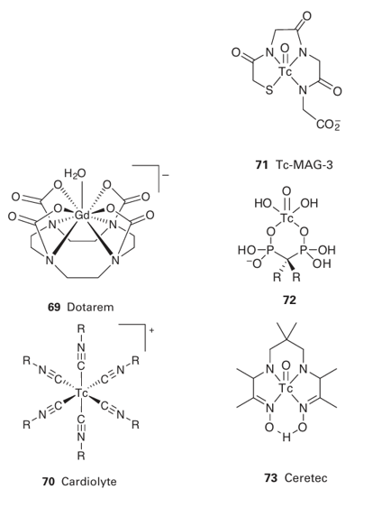 Key point: Particular organs and tissues are targeted according to the ligands that are present. Complexes of gadolinium (III) (f7) are used in magnetic resonance imaging (MRI), which has become an important technique in medical diagnosis. Through their effect on the re laxation time of 1H-NMR spectroscopic resonances, Gd (III) complexes are able to enhance the contrasts between different tissues and highlight details such as the abnormalities of the blood–brain barrier. A number of Gd (III) complexes are approved for clinical use, each exhibiting different degrees of rejection or retention by certain tissues, as well as stability, rates of water exchange, and magnitude of relaxation parameters. All are based on chelating ligands, particularly those having multiple carboxylate groups. One example is the complex (69) formed with the macrocyclic aminocarboxylate ligand DOTA, which is known as dotarem. Technetium is an artificial element that is produced by a nuclear reaction, but it has found an important use as an imaging agent. The active radionuclide is 99mTc (m for metastable), which decays by γ-emission and has a half-life of 6 h. Production of 99mTc involves bombarding 98Mo with neutrons and separating it as it is formed from the unstable product 99Mo: