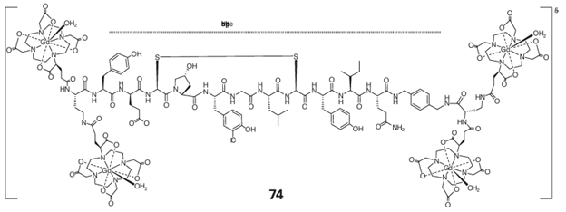 Tracers are being developed that are much more specific for their targets. These tracers contain the metal in a stable coordination sphere that is covalently linked to a biologically active fragment. An example is the Gd contrast agent EP-210R (74), which contains four Gd3 complexes linked to a peptide that recognizes and binds to fibrin, a molecule produced by thrombi (blood clots).