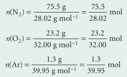 The mass percentage composition of dry air at sea level is approximately N2: 75.5; O2: 23.2; Ar: 1.3. What is the partial pressure of each component when the total pressure is 1.00 atm? Method We expect species with a high mole fraction to have a proportionally high partial pressure. Partial pressures are defined by eqn 1.13. To use the equation, we need the mole fractions of the components. To calculate mole fractions, which are defined by eqn 1.14, we use the fact that the amount of molecules J of molar mass MJ in a sample of mass mJ is nJ= mJ/MJ. The mole fractions are independent of the total mass of the sample, so we can choose the latter to be 100 g (which makes the conversion from mass percentages very easy). Thus, the mass of N2 present is 75.5 per cent of 100 g, which is 75.5 g. Answer The amounts of each type of molecule present in 100 g of air, in which the masses of N2, O2, and Ar are 75.5 g, 23.2 g, and 1.3 g, respectively, are