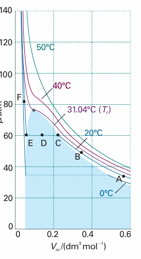 Fig. 1.15 Experimental isotherms of carbon dioxide at several temperatures. The ‘critical isotherm’, the isotherm at the critical temperature, is at 31.04°C. The critical point is marked with a star. treated as the first term in a series in powers of a variable (in this case p). A more convenient expansion for many applications is