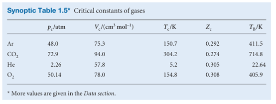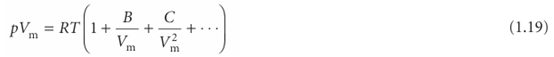The coefficients B, C,..., which depend on the temperature, are the second, third, ...virial coefficients (Table 1.4); the first virial coefficient is 1. The third virial coefficient, C, is usually less important than the second coefficient, B, in the sense that at typical molar volumes C/V2m << B/Vm.