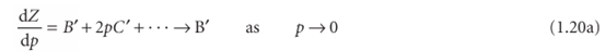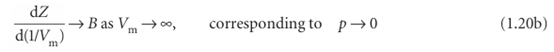 However, B′ is not necessarily zero, so the slope of Z with respect to p does not necessarily approach 0 (the perfect gas value), as we can see in Fig. 1.14. Because several physical properties of gases depend on derivatives, the properties of real gases do not always coincide with the perfect gas values at low pressures. By a similar argument,