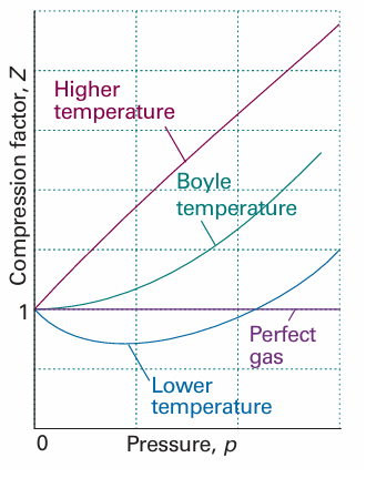 Fig. 1.16 The compression factor, Z, approaches 1 at low pressures, but does so with different slopes. For a perfect gas, the slope is zero, but real gases may have either positive or negative slopes, and the slope may vary with temperature. At the Boyle temperature, the slope is zero and the gas behaves perfectly over a wider range of conditions than at other temperatures.