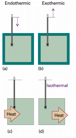 Fig. 2.2 (a) When an endothermic process occurs in an adiabatic system, the temperature falls; (b) if the process is exothermic, then the temperature rises. (c) When an endothermic process occurs in a diathermic container, energy enters as heat from the surroundings, and the system remains at the same temperature. (d) If the process is exothermic, then energy leaves as heat, and the process is isothermal.
