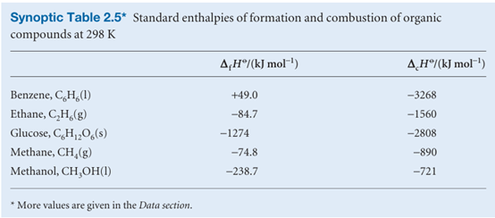 The value quoted shows that 2808 kJ of heat is released when 1 mol C6H12O6 burns under standard conditions (at 298 K). Some further values are listed in Table 2.5.