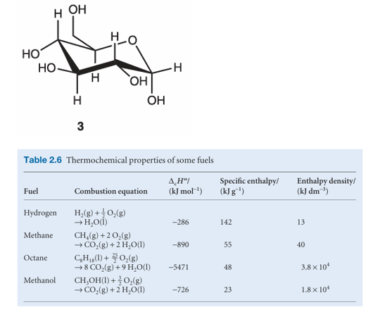 The thermochemical properties of fuels Table 2.6 and foods are commonly discussed in terms of their specific enthalpy, the enthalpy of combustion per gram of material. Thus, if the standard enthalpy of combustion is ∆cHo and the molar mass of the com pound is M, then the specific enthalpy is ∆cHo/M. Table 2.6 lists the specific enthalpies of several fuels. A typical 18–20-year-old man requires a daily input of about 12 MJ; a woman of the same age needs about 9 MJ. If the entire consumption were in the form of glucose (3; which has a specific enthalpy of 16 kJ g−1), that would require the consumption of 750 g of glucose for a man and 560 g for a woman. In fact, digestible carbohydrates have a slightly higher specific enthalpy (17 kJ g−1) than glucose itself, so a carbohydrate