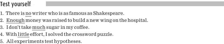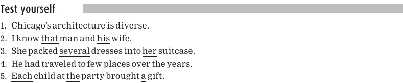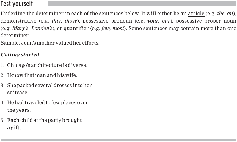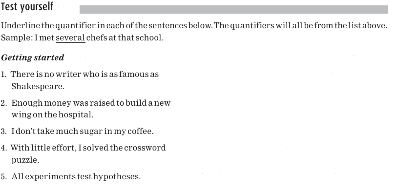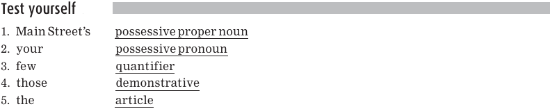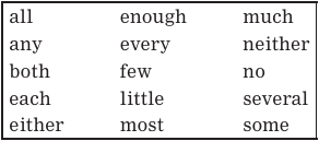 There are words, such as every and several, that indicate amount, or quantity, and these are called quantifiers. Quantifiers can act as determiners; that is, they can come before and introduce a noun. The determiners are underlined in the following sentences: