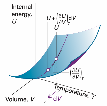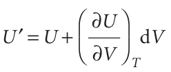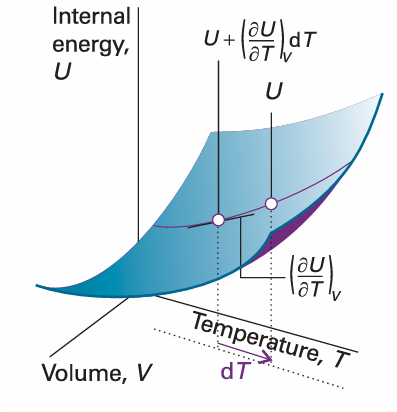 The coefficient (∂U/∂V) T, the slope of a plot of U against V at constant temperature, is the partial derivative of U with respect to V (Fig. 2.21). If, instead, T changes to T + dT at constant volume (Fig. 2.22), then the internal energy changes to