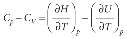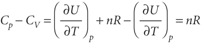 That is, although the constant-volume heat capacity of a perfect gas is defined as the slope of a plot of internal energy against temperature at constant volume, for a perfect gas CV is also the slope at constant pressure. Equation 2.46 provides an easy way to derive the relation between Cp and CV for a perfect gas expressed in eqn 2.26. Thus, we can use it to express both heat capacities in terms of derivatives at constant pressure: