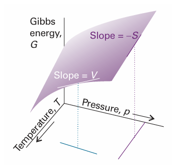 These relations show how the Gibbs energy varies with temperature and pressure (Fig. 3.18). The first implies that: • Because S>0 for all substances, G always decreases when the temperature is raised (at constant pressure and composition). • Because (∂G/∂T)p becomes more negative as S increases, G decreases most sharply when the entropy of the system is large. Therefore, the Gibbs energy of the gaseous phase of a substance, which has a high molar entropy, is more sensitive to temperature than its liquid and solid phases (Fig. 3.19). Similarly, the second relation implies that: • Because V > 0 for all substances, G always increases when the pressure of the system is increased (at constant temperature and composition).