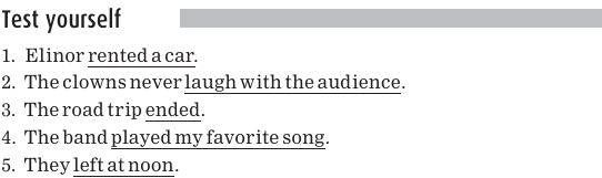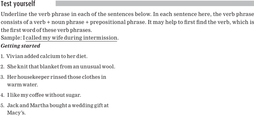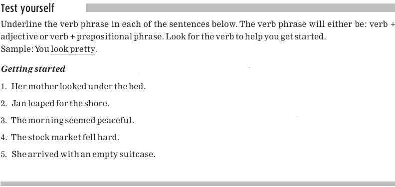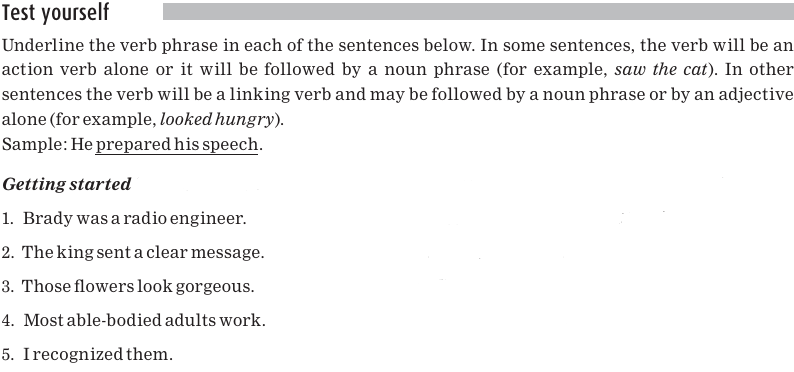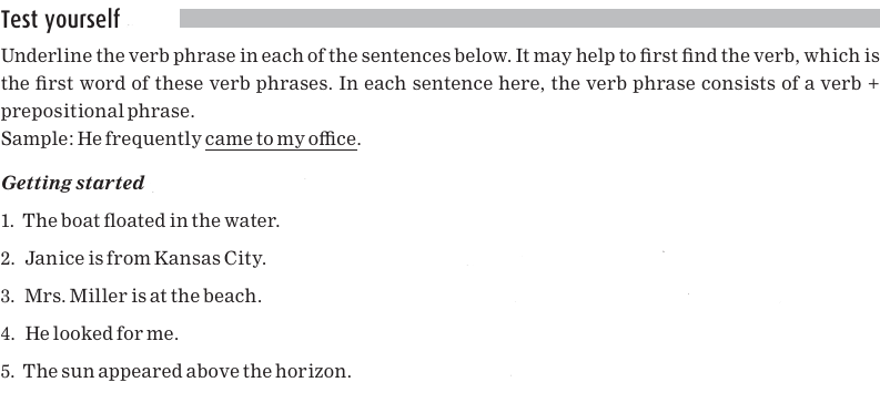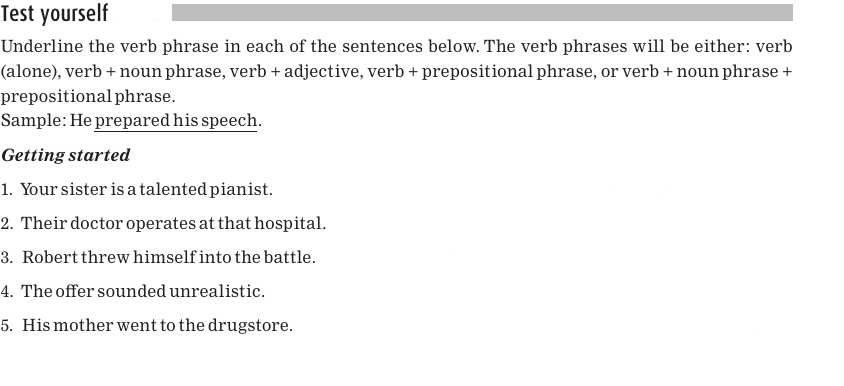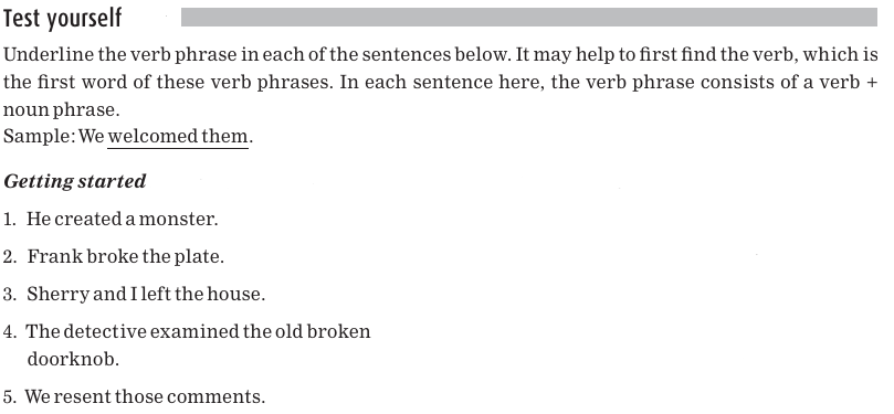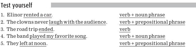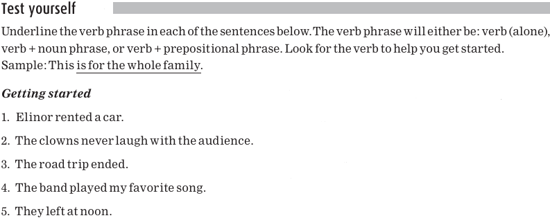 Have you noticed anything that all the underlined verb phrases in sentences 1-5 have in common? Each verb phrase has a verb. In fact, in sentence 1, the verb phrase has nothing in it but a verb, left. A verb phrase may also have other words, as you can see in sentences 2-5, but the least that every verb phrase has to have is a verb.