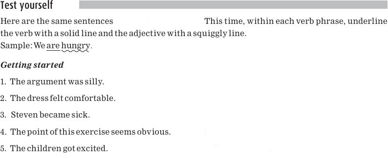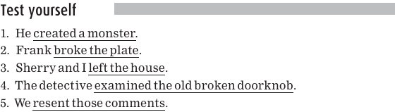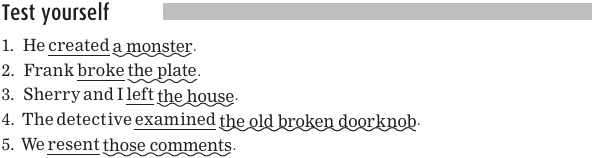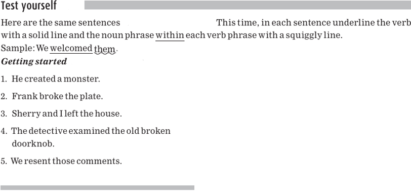 In each sentence, the verb phrase is underlined, and each verb phrase consists of a verb+ noun phrase. (Saw and is are the verbs and the teacher is the noun phrase.) But can you see how the verb phrases in sentences11 and 12 differ? You’ve probably noticed that in sentence 11, the teacher is receiving the action, but in sentence 12, there is no action (after all, is is a linking verb, not an action verb). So while the structures of sentences 11 and 12 appear to be similar on the surface, the sentences are quite different in meaning.