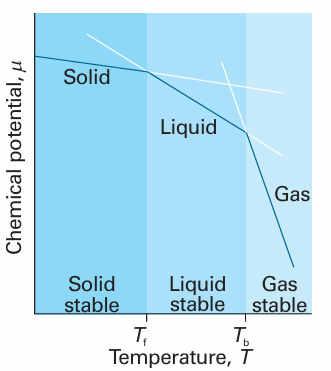 Fig. 4.9 The schematic temperature dependence of the chemical potential of the solid, liquid, and gas phases of a substance (in practice, the lines are curved). The phase with the lowest chemical potential at a specified temperature is the most stable one at that temperature. The transition temperatures, the melting and boiling temperatures (Tf and Tb, respectively), are the temperatures at which the chemical potentials of the two phases are equal.