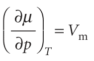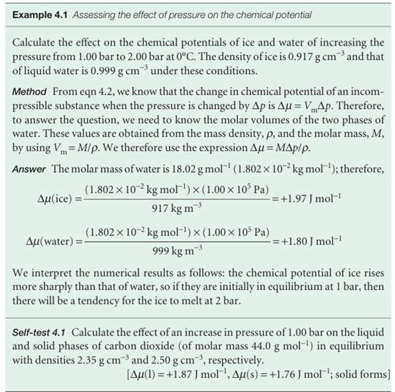 This equation shows that the slope of a plot of chemical potential against pressure is equal to the molar volume of the substance. An increase in pressure raises the chemical potential of any pure substance (because Vm > 0). In most cases, Vm(l) > Vm(s) and the equation predicts that an increase in pressure increases the chemical potential of the liquid more than that of the solid. As shown in Fig. 4.10a, the effect of pressure in such a case is to raise the melting temperature slightly. For water, however, Vm(l) < Vm(s), and an increase in pressure increases the chemical potential of the solid more than that of the liquid. In this case, the melting temperature is lowered slightly (Fig. 4.10b).