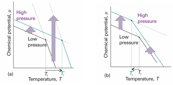Fig. 4.10 The pressure dependence of the chemical potential of a substance depends on the molar volume of the phase. The lines show schematically the effect of increasing pressure on the chemical potential of the solid and liquid phases (in practice, the lines are curved), and the corresponding effects on the freezing temperatures. (a) In this case the molar volume of the solid is smaller than that of the liquid and µ(s) increases less than µ(l). As a result, the freezing temperature rises. (b) Here the molar volume is greater for the solid than the liquid (as for water), µ(s) increases more strongly than µ(l), and the freezing temperature is lowered.