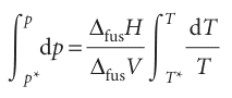 where ∆fusV is the change in molar volume that occurs on melting. The enthalpy of melting is positive (the only exception is helium-3) and the volume change is usually positive and always small. Consequently, the slope dp/dT is steep and usually positive (Fig. 4.13). We can obtain the formula for the phase boundary by integrating dp/dT, assuming that ∆fusH and ∆fusV change so little with temperature and pressure that they can be treated as constant. If the melting temperature is T* when the pressure is p*, and T when the pressure is p, the integration required is
