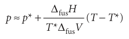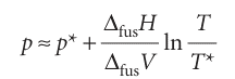 Melting (fusion) is accompanied by a molar enthalpy change ∆fusH and occurs at a temperature T. The molar entropy of melting at T is therefore ∆fusH/T (Section 3.3), and the Clapeyron equation becomes