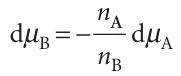 Because the total Gibbs energy of a binary mixture is given by eqn 5.5 and the chemical potentials depend on the composition, when the compositions are changed infinitesimally we might expect G of a binary system to change by , dG=µAdnA+µBdnB+nAdµA+nBdµB , However, we have seen that at constant pressure and temperature a change in Gibbs energy is given by eqn 5.7. Because G is a state function, these two equations must be equal, which implies that at constant temperature and pressure , nAdµA +nBdµB=0 , This equation is a special case of the Gibbs–Duhem equation: