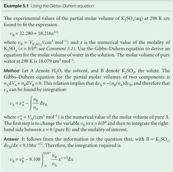 The same line of reasoning applies to all partial molar quantities. We can see in Fig. 5.1, for example, that, where the partial molar volume of water increases, that of ethanol decreases. Moreover, as eqn 5.13 shows, and as we can see from Fig. 5.1, a small change in the partial molar volume of A corresponds to a large change in the partial molar volume of B if nA/nB is large, but the opposite is true when this ratio is small. In practice, the Gibbs–Duhem equation is used to determine the partial molar volume of one component of a binary mixture from measurements of the partial molar volume of the second component.