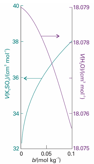 Fig. 5.5 The partial molar volumes of the components of an aqueous solution of potassium sulfate.