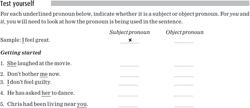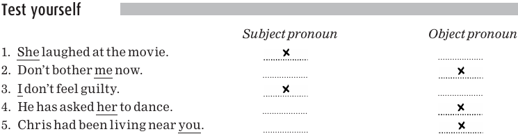 In contrast, there are subject pronouns and object pronouns. Subject pronouns are used when a pronoun is functioning as the subject of a sentence. The subject pronoun is underlined in the following sentences: