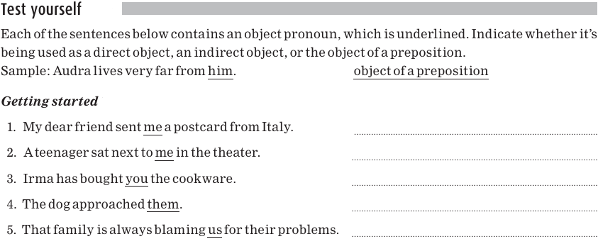 Object pronouns are used in all other contexts. The three major uses for object pronouns are: direct object (Direct objects), indirect object (Indirect objects), and object of a preposition (The basic structure of prepositional phrases). The object pronouns are underlined in the following sentences: