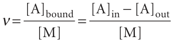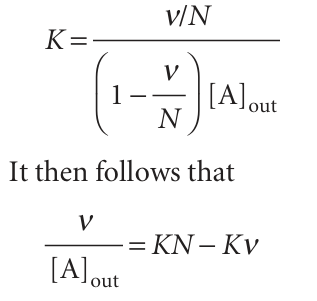 Fig. 5.30 A Scatchard plot of ν/[A]out against ν. The slope is –K and the intercept at ν = 0 is KN.