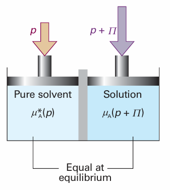 Justification 5.3 The van ’t Hoff equation On the pure solvent side the chemical potential of the solvent, which is at a pressure p, is µA*(p). On the solution side, the chemical potential is lowered by the presence of the solute, which reduces the mole fraction of the solvent from 1 to xA. However, the chemical potential of A is raised on account of the greater pressure, p + Π, that the solution experiences. At equilibrium the chemical potential of A is the same in both compartments, and we can write