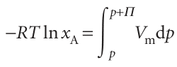This expression enables us to calculate the additional pressure Π that must be applied to the solution to restore the chemical potential of the solvent to its ‘pure’ value and thus to restore equilibrium across the semipermeable membrane. For dilute solutions, ln xA may be replaced by ln (1 − xB) ≈−xB. We may also assume that the pressure range in the integration is so small that the molar volume of the solvent is a constant. That being so, Vm may be taken outside the integral, giving