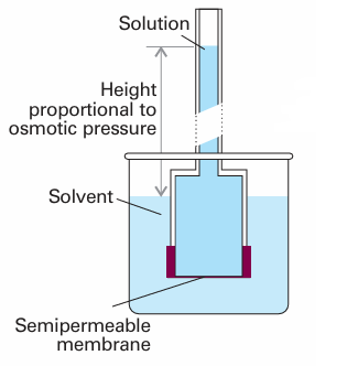 The phenomenon of osmosis (from the Greek word for ‘push’) is the spontaneous passage of a pure solvent into a solution separated from it by a semipermeable mem brane, a membrane permeable to the solvent but not to the solute (Fig. 5.27). The osmotic pressure, Π, is the pressure that must be applied to the solution to stop the influx of solvent. Important examples of osmosis include transport of fluids through cell membranes, dialysis and osmometry, the determination of molar mass by the measurement of osmotic pressure. Osmometry is widely used to determine the molar masses of macromolecules. In the simple arrangement shown in Fig. 5.28, the opposing pressure arises from the head of solution that the osmosis itself produces. Equilibrium is reached when the hydrostatic pressure of the column of solution matches the osmotic pressure. The complicating feature of this arrangement is that the entry of solvent into the solution results in its dilution, and so it is more difficult to treat than the arrangement in Fig. 5.27, in which there is no flow and the concentrations remain unchanged. The thermodynamic treatment of osmosis depends on noting that, at equilibrium, the chemical potential of the solvent must be the same on each side of the membrane. The chemical potential of the solvent is lowered by the solute, but is restored to its ‘pure’ value by the application of pressure. As shown in the Justification below, this equality implies that for dilute solutions the osmotic pressure is given by the van ’t Hoff equation: