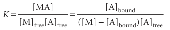 The bound and unbound A molecules are in equilibrium, M + A → MA, so their concentrations are related by an equilibrium constant K, where