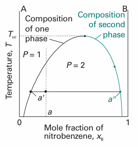 Suppose a small amount of a liquid B is added to a sample of another liquid A at a temperature T′. It dissolves completely, and the binary system remains a single phase. As more B is added, a stage comes at which no more dissolves. The sample now consists of two phases in equilibrium with each other (P = 2), the most abundant one consisting of A saturated with B, the minor one a trace of B saturated with A. In the temperature–composition diagram drawn in Fig. 6.19, the composition of the former is represented by the point a′ and that of the latter by the point a″. The relative abundances of the two phases are given by the lever rule. When more B is added, A dissolves in it slightly. The compositions of the two phases in equilibrium remain a′ and a″ because P = 2 implies that F′=0, and hence that the compositions of the phases are invariant at a fixed temperature and pressure. However, the amount of one phase increases at the expense of the other. A stage is reached when so much B is present that it can dissolve all the A, and the system reverts to a single phase. The addition of more B now simply dilutes the solution, and from then on it remains a single phase. The composition of the two phases at equilibrium varies with the temperature. For hexane and nitrobenzene, raising the temperature increases their miscibility. The two-phase system therefore becomes less extensive, because each phase in equilibrium is richer in its minor component: the A-rich phase is richer in B and the B-rich phase is richer in A. We can construct the entire phase diagram by repeating the observations at different temperatures and drawing the envelope of the two-phase region.