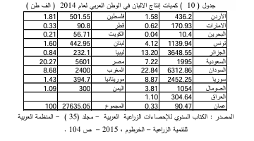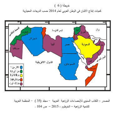 فالوطن العربي من الدول القادرة على الاكتفاء الذاتي لامتلاكها كميات كبيرة من إنتاج الالبان والتي تقدر حسب إحصائية عام 2014 (27.64) مليون طن من الالبان وهذه الكميات كافية لإعالة اعداد سكان الوطن العربي البالغ عددهم في عام 2014 (391.042) مليون شخص تصدرت السودان المرتبة الأولى في إنتاج الحليب فقد بلغت كمية إنتاجها لعام 2014 (3612.86) الف طن بحيث شكلت نسبة قدرها (22.84%) من إنتاج الوطن العربي وبدرجة معيارية قدرها (265) ، واحتلت مصر المرتبة الثانية بإنتاج قدره ( 5601 ) الف طن وبنسبة قدرها (20.3% ) وبدرجة معيارية قدرها (2.27) وجاءت الجزائر بالمرتبة الثالثة بنسبة قدرها (13.2%) وبدرجة معيارية قدرها ( 1.22) ، ويعود هذا الإنتاج من الألبان الى تصدر هذه الدول في اعداد حيوانات الابقار التي تعتبر الممون الرئيسي للحليب في الوطن العربي . جدول ( 10 ) خريطة (6).