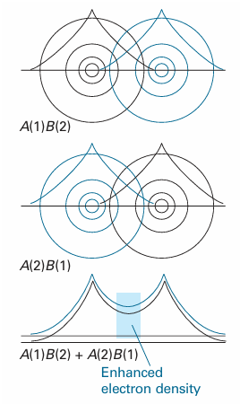Fig. 11.2 It is very difficult to represent valence-bond wavefunctions because they refer to two electrons simultaneously. However, this illustration is an attempt. The atomic orbital for electron 1 is represented by the black contours, and that of electron 2 is represented by the blue contours. The top illustration represents A(1)B(2), and the middle illustration represents the contribution A(2)B(1). When the two contributions are superimposed, there is interference between the black contributions and between the blue contributions, resulting in an enhanced (two-electron) density in the internuclear region.
