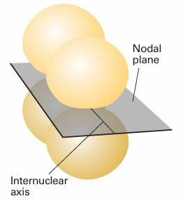 Fig. 11.4 A π bond results from orbital overlap and spin pairing between electrons in p orbitals with their axes perpendicular to the internuclear axis. The bond has two lobes of electron density separated by a nodal plane.