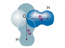 Fig. 11.6 A first approximation to the valence-bond description of bonding in an H2O molecule. Each σ bond arises from the overlap of an H1s orbital with one of the O2porbitals. This model suggests that the bond angle should be 90°, which is significantly different from the experimental value.